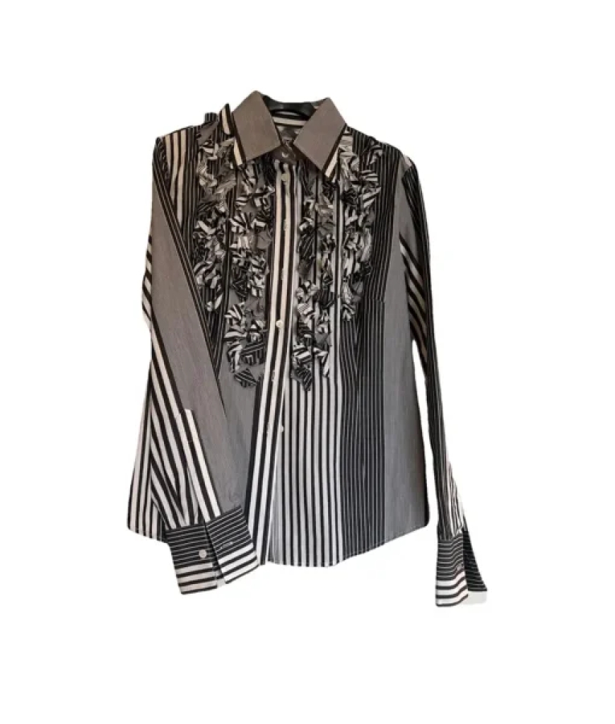 The striped ruffle shirt perfectly encapsulates Emily's journey from an American newcomer to a confident Parisian professional. It masterfully blends the classic, tailored authority of grey pinstripes—symbolizing her hard-earned business savvy—with the playful, romantic flourish of exaggerated ruffles, which represent her inherent creativity and optimistic personality. This fusion visually communicates her core identity: a professional who respects tradition but confidently rewrites it with her own unique flair.
